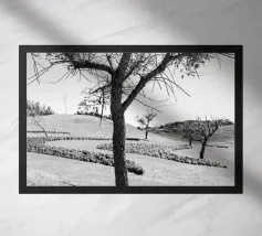 "Barbed Wire Trench" Dramatic Monochrome Print! This intense black and white photograph captures a textured landscape dominated by coils of sharp barbed wire in the foreground, creating a feeling of tension and restriction. In the distance, concrete structures and steps descend into an earthwork or trench. The image evokes historical memory, military history, and rugged solitude. Perfect wall art for a modern office, minimalist space, or for collectors interested in powerful documentary photography and post-war landscapes. Black and White Photography, Monochrome, Historical, Barbed Wire,
