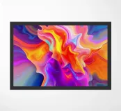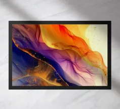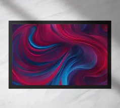 Vivid abstract art displays dynamic swirls and flowing patterns in a mesmerizing blend of bright colors including blue, purple, orange, and pink. The artwork captures a sense of movement and energy.