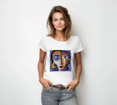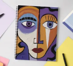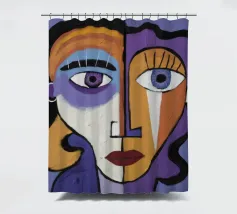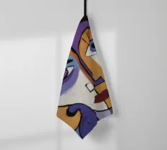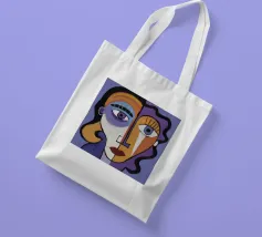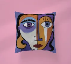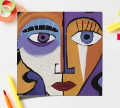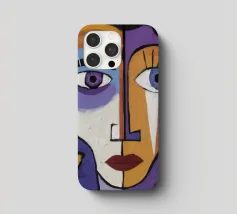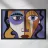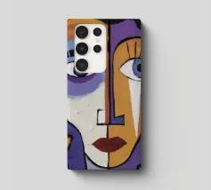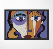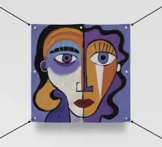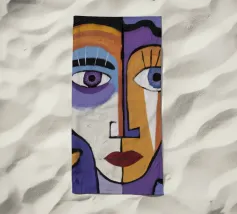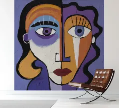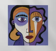 This artwork features a face with exaggerated features and bold lines. The background is a mix of purple and orange, creating a dramatic and elegant effect.