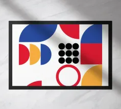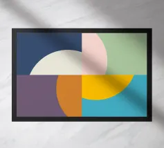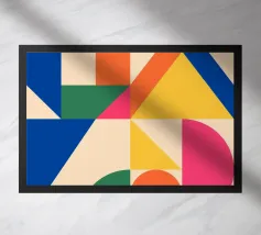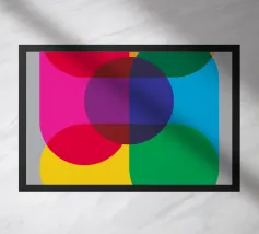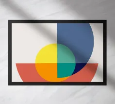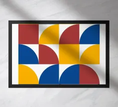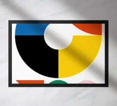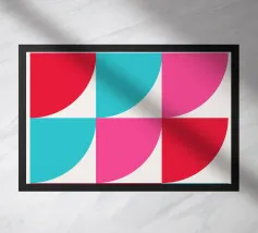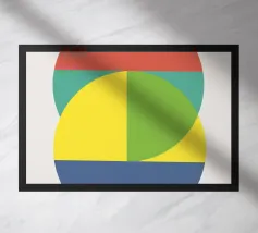 Inject vibrant energy into your space with this captivating abstract geometric art print. The design features a dynamic composition of bold color blocks and circles, creating a playful yet sophisticated visual. A large quadrant shape, split into yellow, red, blue, and hot pink, frames a central circular motif that mirrors these hues in its own divisions. This piece exudes a cheerful, contemporary vibe, perfect for adding a modern pop to any room. Produced at an impressive 7000x5000 pixels resolution and 300 dpi, this high-quality digital art ensures every crisp line and vivid color is rendered