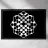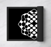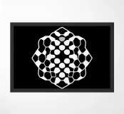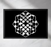 A striking abstract pattern composed of white interlocking geometric shapes covers a solid black background, creating a visually intriguing effect.