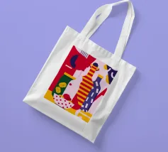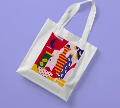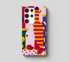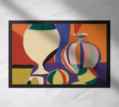 A bold and abstract representation of kitchen essentials like oil and vinegar bottles, rendered in a graphic, deconstructed style with primary colors.