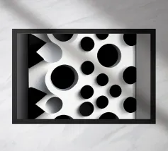 A vibrant array of overlapping circles in differing shades of gray, black, and white creates an engaging visual pattern. The design features contrasting tones that add depth.
