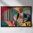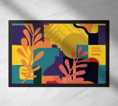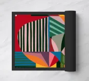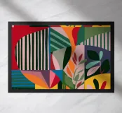 A vibrant and dynamic abstract composition featuring a mix of colorful leaf shapes, bold patterns like stripes and dots, and energetic forms. The piece is a modern, joyful, and artistic celebration of color and design.