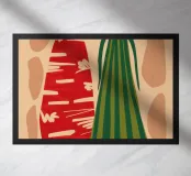 An abstract illustration of two stylized figures wearing boldly patterned red and green clothes, their forms simplified and elegant.