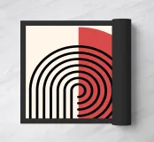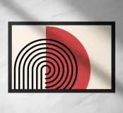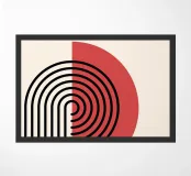 Step into a fusion of retro and modernist aesthetics with this striking abstract art print. The design features a bold red semicircle juxtaposed with a complex arrangement of black concentric arches and parallel lines, creating a visually compelling and dynamic composition reminiscent of 70s graphic design. This piece embodies both a playful retro charm and a clean, contemporary feel. Produced at an impressive 7000x5000 pixels resolution and 300 dpi, this high-quality digital art ensures every crisp line and vibrant hue is rendered with exceptional precision, making it a compelling addition to