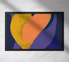 An abstract composition of overlapping, rounded shapes in yellow, orange, and deep blue, suggesting a reclining human form in a minimalist and fluid style, exploring the essence of shape and color.