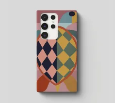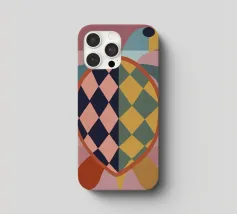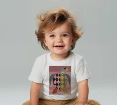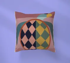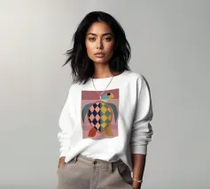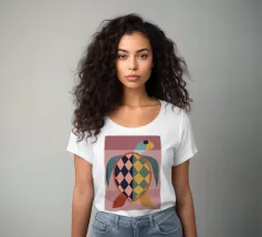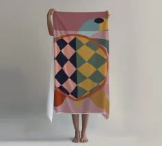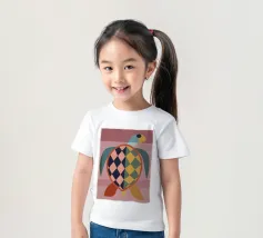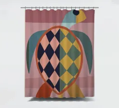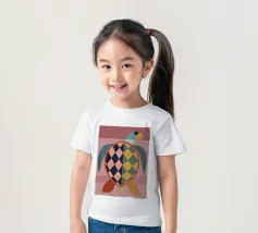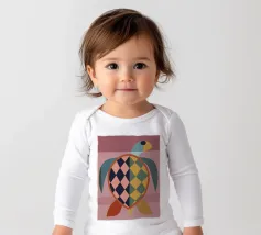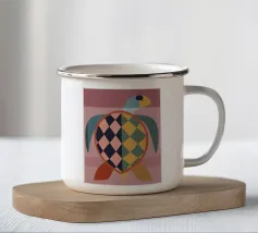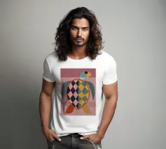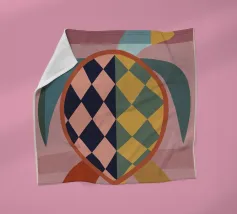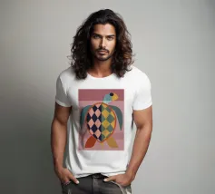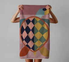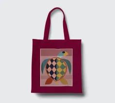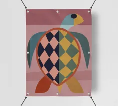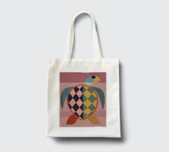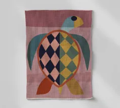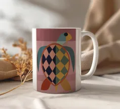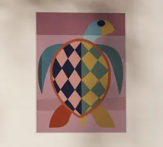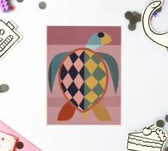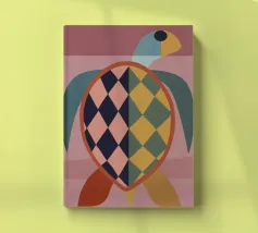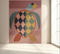 Abstract illustration of a turtle created with geometric shapes and a soft, modern color palette.