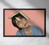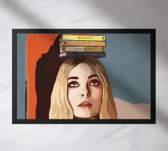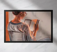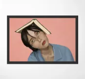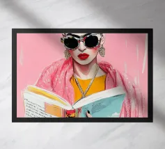A whimsical portrait of a young woman in oversized glasses and a relaxed blue shirt, with an open book balanced playfully on her head. Set against a soft pink background, the illustration blends humor and quiet perseverance, perfect for students, book lovers, and anyone who’s ever felt “almost there.” Ideal for study spaces, dorms, or thoughtful gifts.