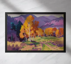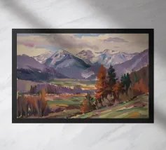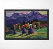 A mountain landscape painting showcases stylized haystacks in a field before a backdrop of majestic, sharply peaked mountains in blues and purples, under a dramatic, colorful sky.