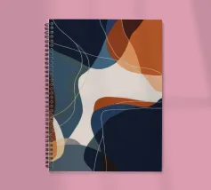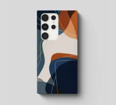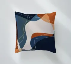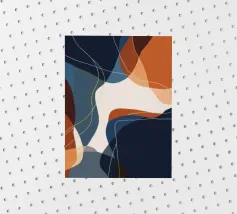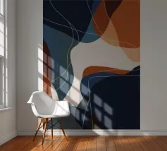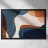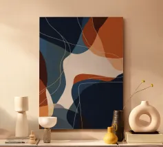 Curved navy and rust forms intersect with amber lines in a tightly woven composition.