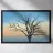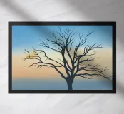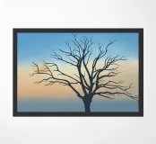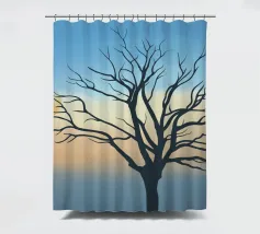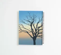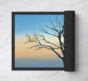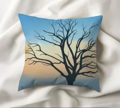 A silhouette of a leafless tree stands against a gradient sky transitioning from light blue to warm orange and yellow tones. The branches spread out intricately, creating a dramatic contrast and emphasizing the peaceful sky.
