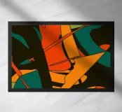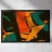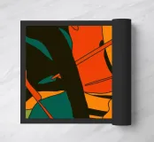 A moody and dynamic abstract pattern of overlapping leaf shapes in a warm, autumnal palette of orange, green, and black. The artwork is energetic and full of organic movement.