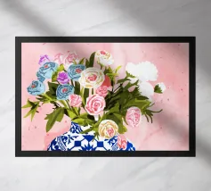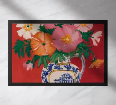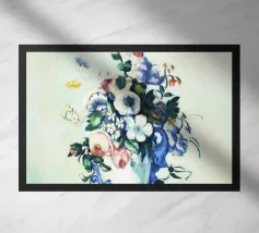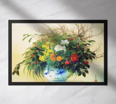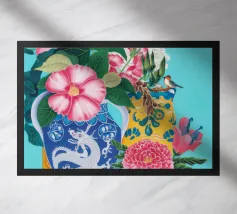 A vibrant still life featuring a blue and white patterned vase overflowing with blue hydrangeas and other flowers, with butterflies, against a bright turquoise background.