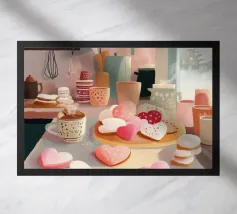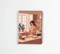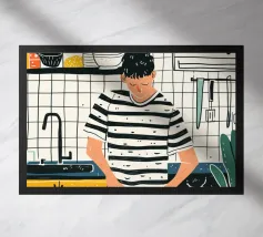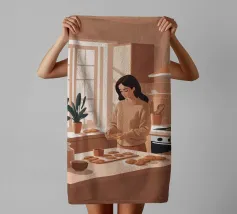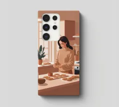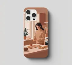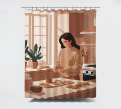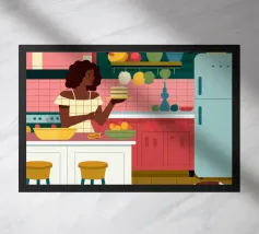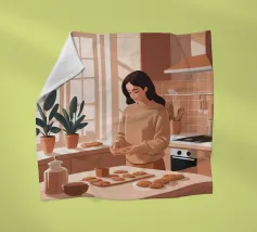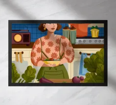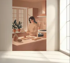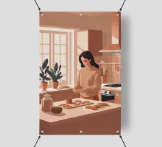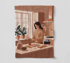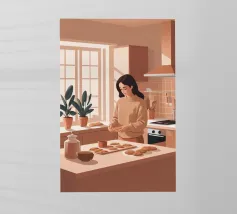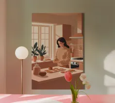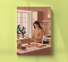 A heartwarming minimalist illustration of a woman baking cookies in a sunlit kitchen. The gentle colors and relaxed atmosphere make this piece perfect for kitchens or cozy dining spaces, evoking the scent of home and slow living