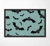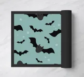 Cartoon bats with smiling faces fly across a blue-green background scattered with small stars. The playful design creates a whimsical and fun atmosphere.