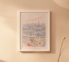 I would describe my art as delicate and playful, mixed with lots of Parisian vibes. I like to romanticize daily life and focus on the little things such as a nice bouquet, a beautiful view from a window, or quality time with some coffee, a croissant and a good book.