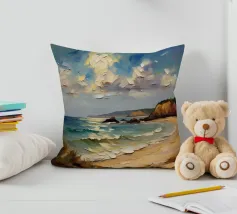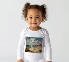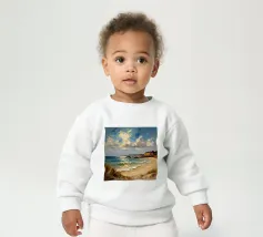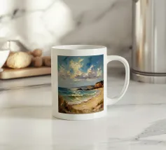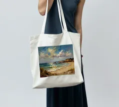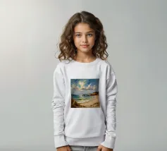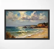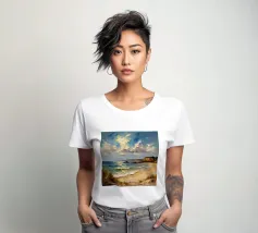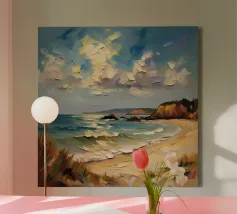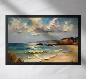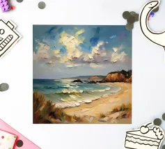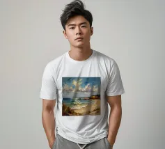 A golden stretch of silky sand extends far and wide, embracing the turquoise sea like a precious gem. The radiant sunlight kisses the shore, casting shimmering streaks that glisten like gold. Gentle waves whisper softly, like a melodious song of the ocean. The scene unfolds a tranquil, romantic beauty—where time seems to stand still, and the soul becomes one with the vastness of nature.