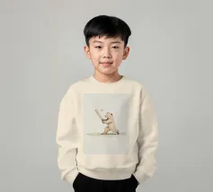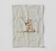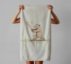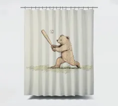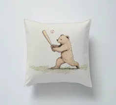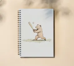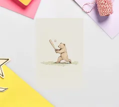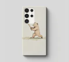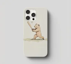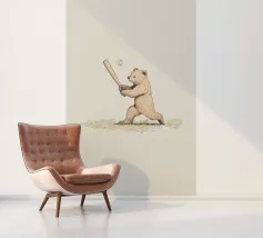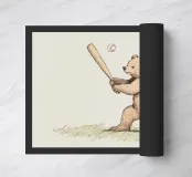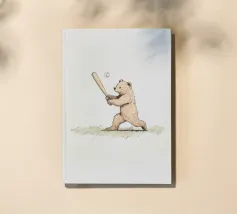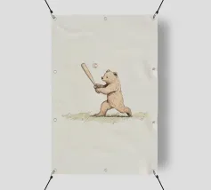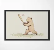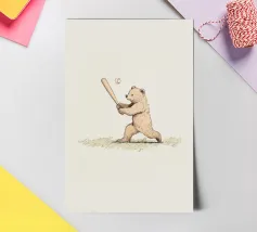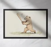 Whimsical illustration of a bear standing on its hind legs, swinging a baseball bat at a mid-air baseball, set on a patch of grass. This playful scene combines the natural element of the bear with the human activity of playing baseball.