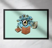 A bespectacled Beholder, surrounded by open books, dives deep into its studies with an air of intellectual curiosity. This whimsical artwork reimagines the iconic fantasy creature as a dedicated scholar, complete with playful nods to "Guide to Rays" and "Petrify for Dummies." A must-have for fantasy enthusiasts, RPG players, and anyone who appreciates a clever and humorous take on classic monsters.