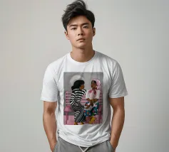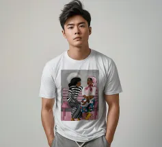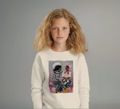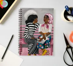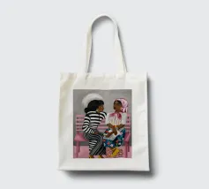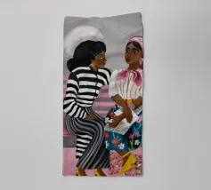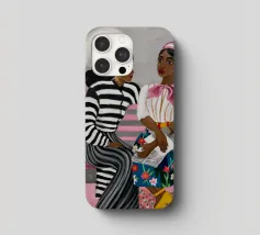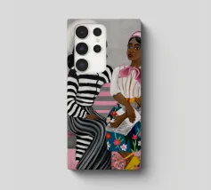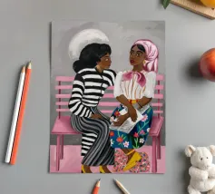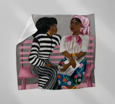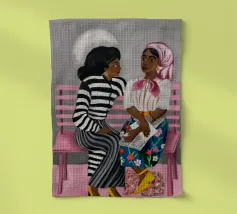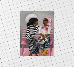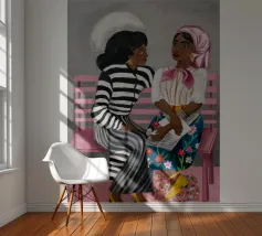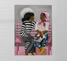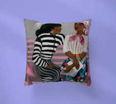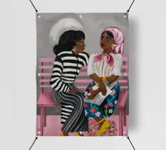 Two individuals are seated on a pink bench, engaged in conversation. Their striped and patterned clothing, along with the simple background, highlight their interaction.