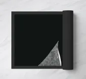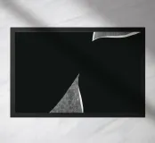 Abstract shapes in contrasting black and white create an intriguing composition, with curving lines forming dynamic geometric forms. The use of stark contrast highlights the interplay between the shapes and the surrounding space.
