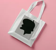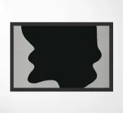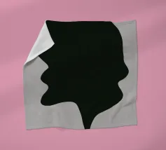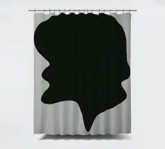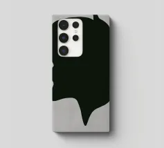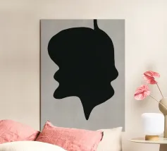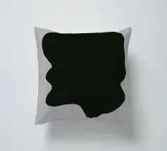 A large, black, abstract shape with smooth curves is set against a light gray background. The form, reminiscent of a dripping silhouette, conveys a minimalist and modern aesthetic.