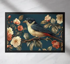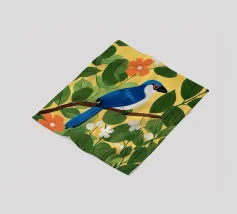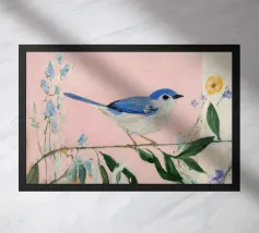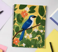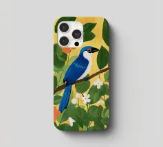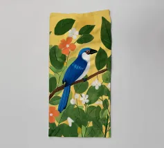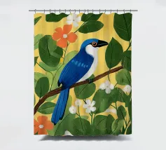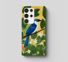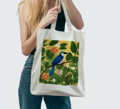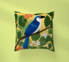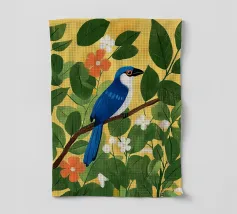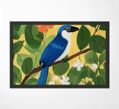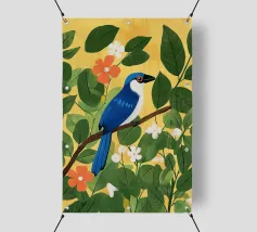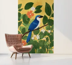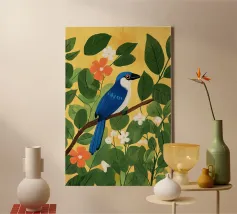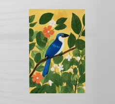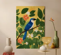 Das Bild zeigt einen stilisierten Blauhäher auf einem Ast, umgeben von grünen Blättern und bunten Blumen. Der Vogel hat ein leuchtend blaues Gefieder mit weißen und schwarzen Akzenten. Der Hintergrund ist sonnig gelb, und die Blüten setzen in Weiß und Orange lebendige Farbakzente. Der Stil wirkt illustrativ und kunstvoll, mit kräftigen Farben und klaren Linien. Es hat einen lebendigen und detailreichen Ausdruck, der die Schönheit der Natur auf eine spielerische Weise einfängt.
