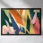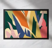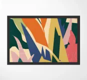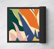 An abstract composition of overlapping leaf and plant forms. The use of bold, solid colors like green, yellow, pink, and dark blue creates a vibrant and modern botanical artwork.