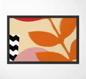 A bold and graphic botanical composition features a large, stylized orange red leaf branch against a background of abstract shapes, creating a powerful and modern statement.