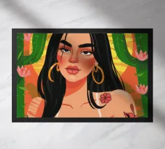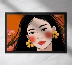 This painting depicts a person with a tattoo of a rose on their shoulder. The person is wearing large, golden earrings, and the background is a striking red, emphasizing the bold and expressive nature of the artwork.