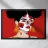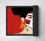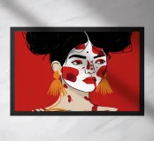 This painting depicts a person with dark hair styled in two buns, wearing large orange earrings. The person's face is painted with bold red and white patterns, and the background is a solid red color.