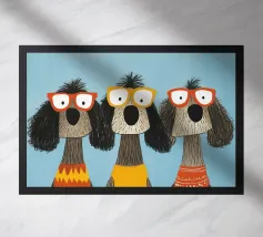 Various stylized dogs of different breeds and colors are playfully arranged in a repeating pattern against a light background. The illustration is fun, quirky, and celebrates canine diversity.