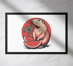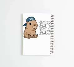 A cute capybara wearing a blue cap with the word "Dude" sits next to large, playful text spelling "CAPYBARA".