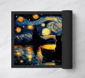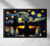 cat boat lake night starry sky swirls reflection water silhouette silhouette of cat bright stars glowing sky night scene rippling water moonlight watercraft shoreline distant buildings twinkling stars luminous reflections