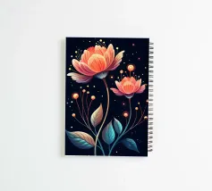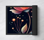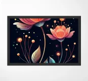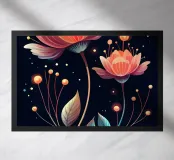 A vibrant and ethereal artwork featuring two luminous flowers against a dark background, adorned with shimmering lights and delicate leaves.