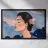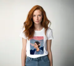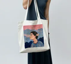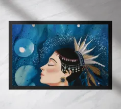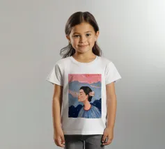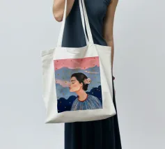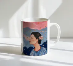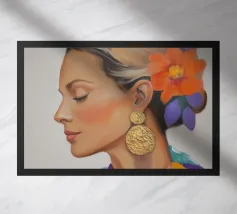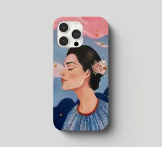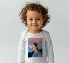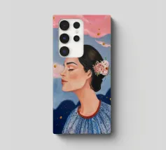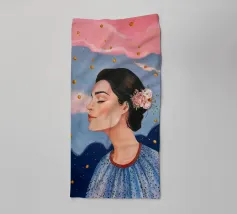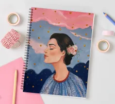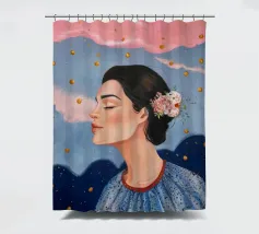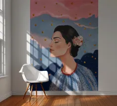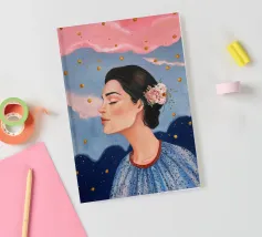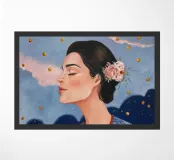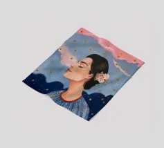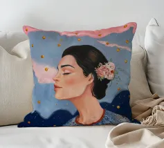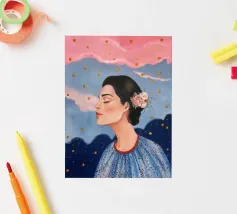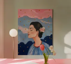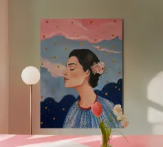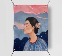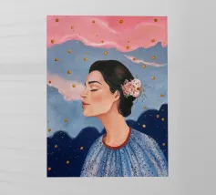 A serene profile portrait of a woman with dark hair, a white flower accent, wearing a blue dotted dress, set against a dreamy pink sky with scattered golden dots.