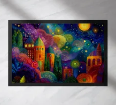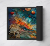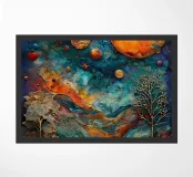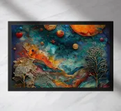 A breathtaking abstract painting that invites you into a celestial dreamscape. Vibrant colors and intricate textures depict a cosmic landscape, featuring a luminous orange moon, swirling galaxies, and ethereal trees. This captivating piece is perfect for adding a touch of otherworldly beauty to any space.