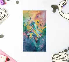 A painting of an elegant, ethereal female figure in shades of blue and green, seemingly in flight or dancing amidst swirling stars and musical notes, suggesting a celestial muse or a dreamlike vision.