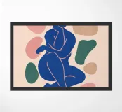 A stylized blue silhouette of a curvy female form, posed gracefully against a backdrop of organic, abstract shapes in pastel and earthy tones.