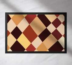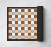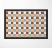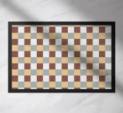 A pattern of alternating colored squares creates a checkerboard effect with shades of beige, gray, and brown. The grid-like design is symmetrical and evenly spaced.