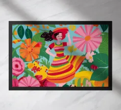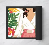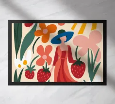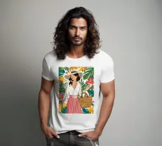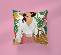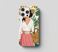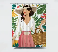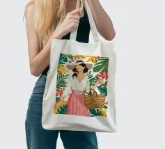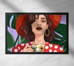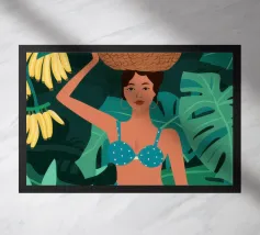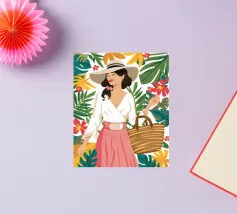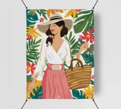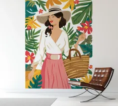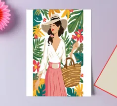 A stylish woman wearing a large sun hat and a chic summer outfit walks through a lush, leafy environment. The illustration exudes elegance, confidence, and the carefree spirit of a sunny vacation.