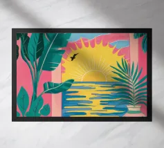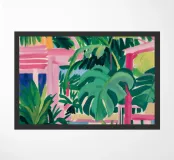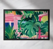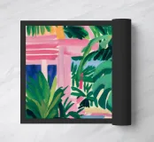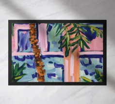An elegant, tranquil scene featuring pink architectural elements, a patterned pathway, and lush green palm leaves, suggesting a modern and chic tropical resort.