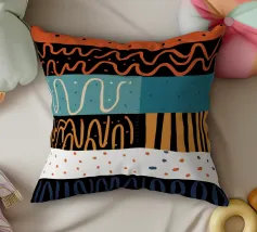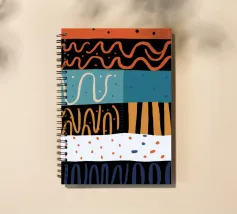 An abstract collage of various patterns, including waves, stripes, and terrazzo, in a coastal inspired palette of blues, oranges, and whites.
