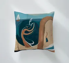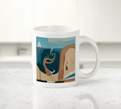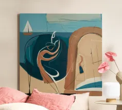 This painting portrays an abstract coastal scene with a sailboat and a figure, using a color palette of blue, beige, and white. The composition is serene and reflective, evoking a sense of calm and contemplation.