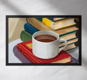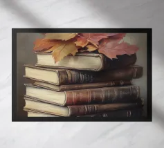 A simple, cozy still life of a cup of hot coffee resting on a stack of old books. The play of light and shadow creates a warm, intellectual, and comforting atmosphere, perfect for any book lover.