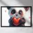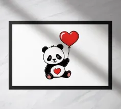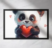 A cute little panda in love with red hearts. The panda is sitting and smiling.
