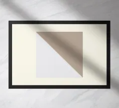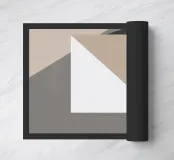 Geometric shapes in neutral tones create an abstract composition with overlapping triangles and a central square. The interplay of light and shadow adds depth to the minimalist design.
