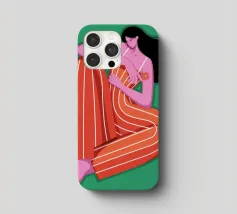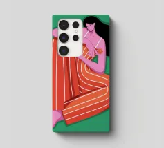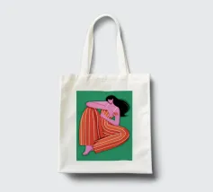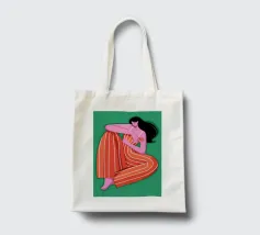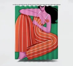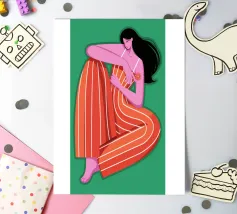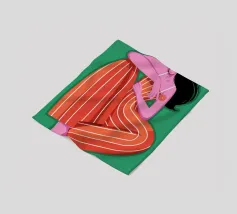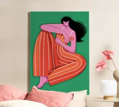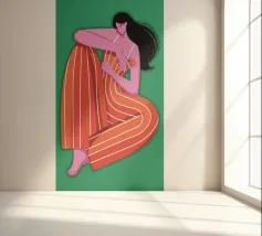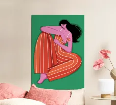 This painting depicts a person sitting with their knees drawn up, wearing a red and orange striped outfit. The background is a solid green, and the person's skin is a vibrant purple, creating a striking and contemplative image.