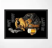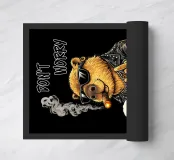 Cool capybara in a leather jacket, smoking a cigar, with a beer in his hand and the words 'Don't worry, be Cappy'.